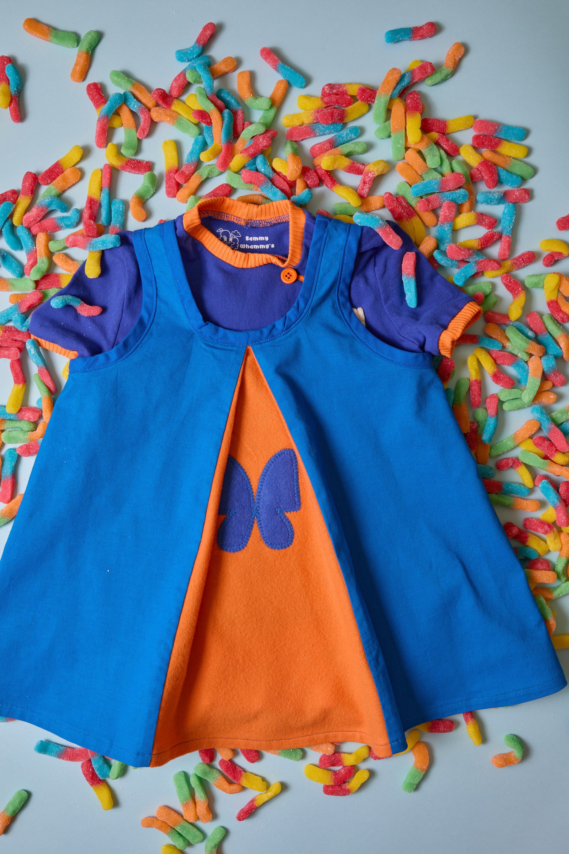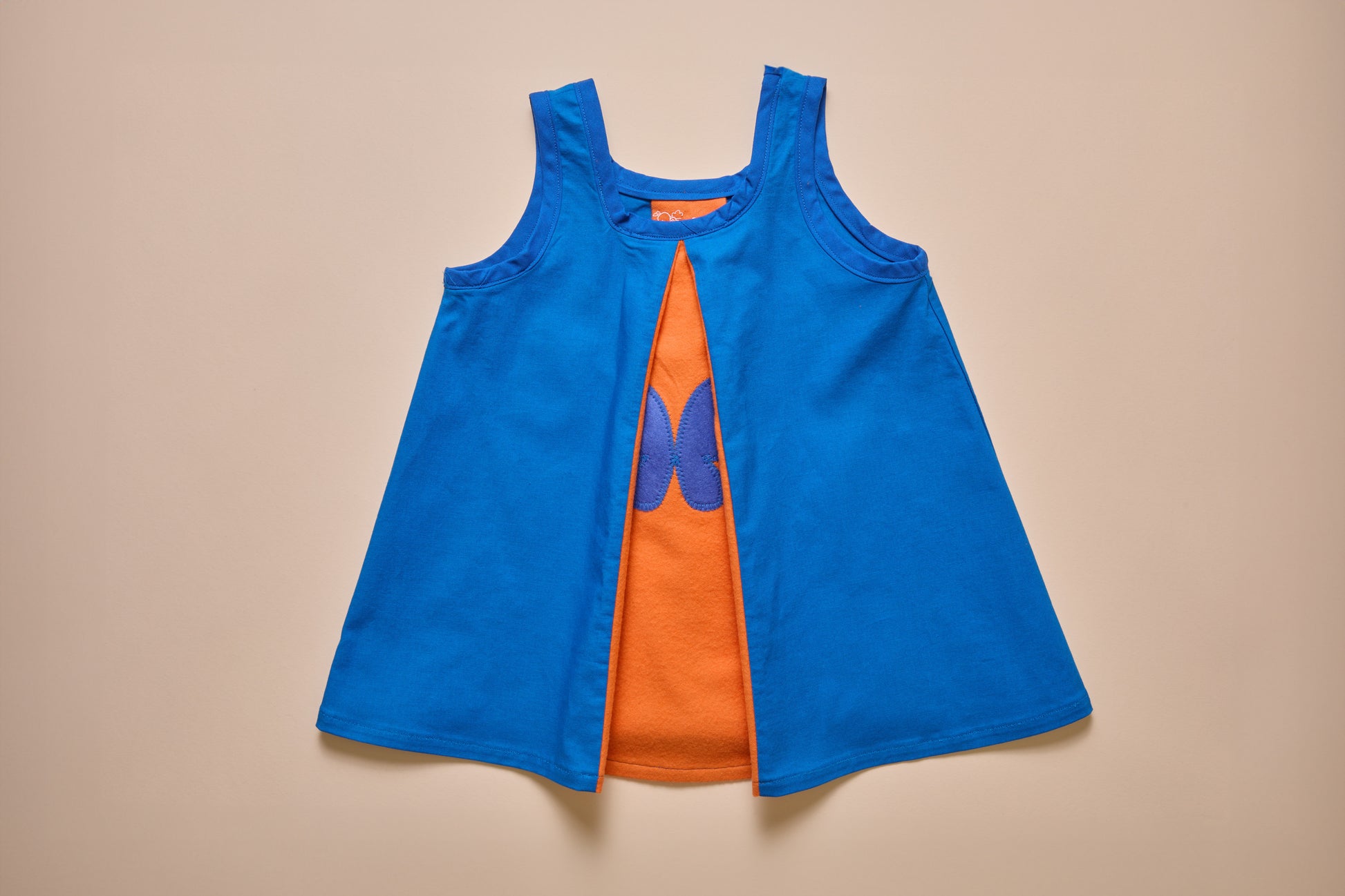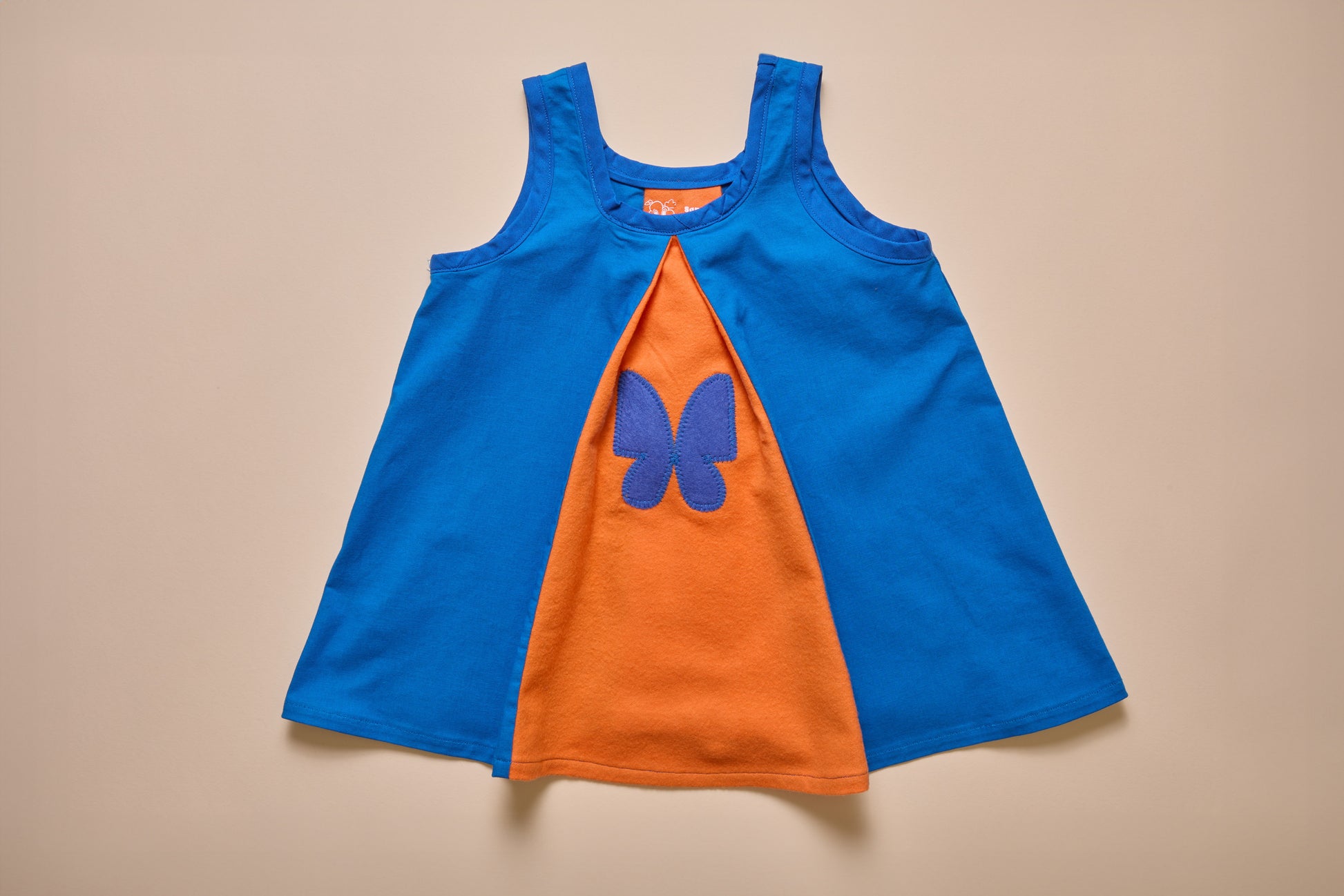 This dress has a secret- a hidden butterfly on the front and back of the dress that is revealed when the pleats open! It encourages the kid wearing it to spin, twirl, and jump around in order to reveal the butterfly. The tent silhouette makes this dress comfortable and easy-on, easy-off. The Flutterbye Dress is a dress your kids are going to be excited to wear.